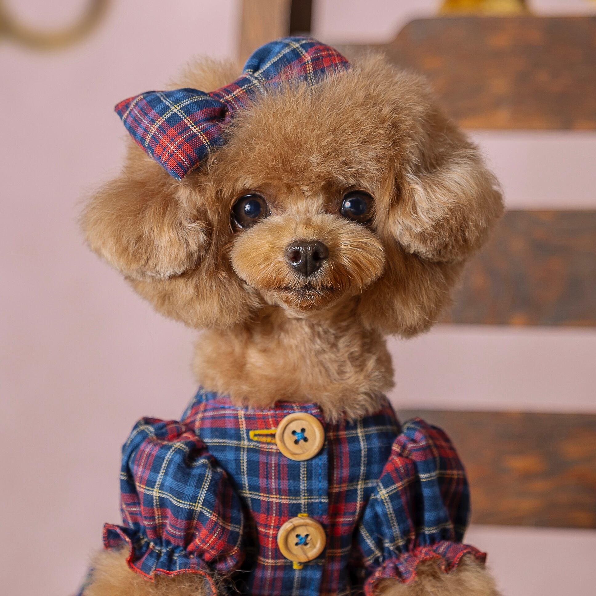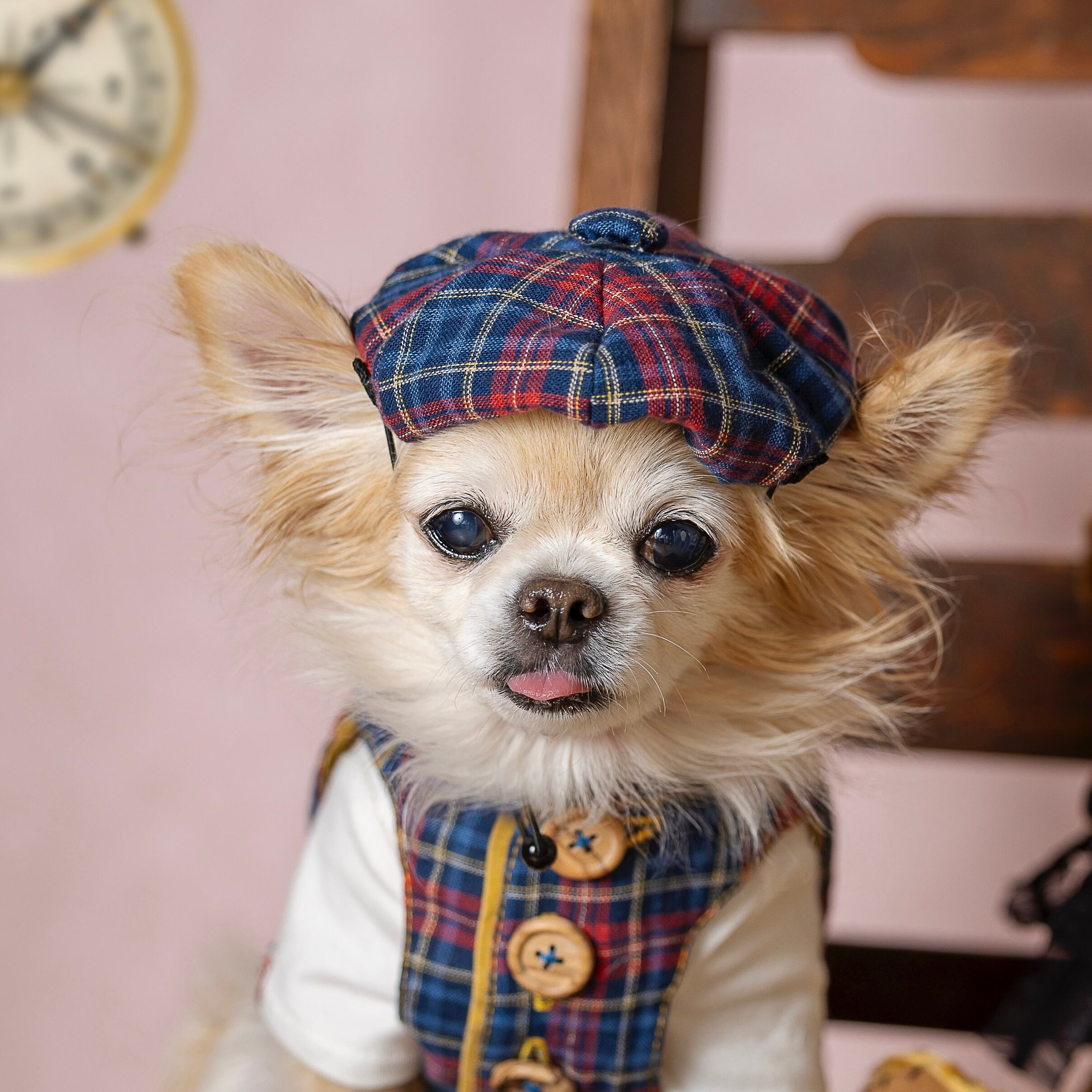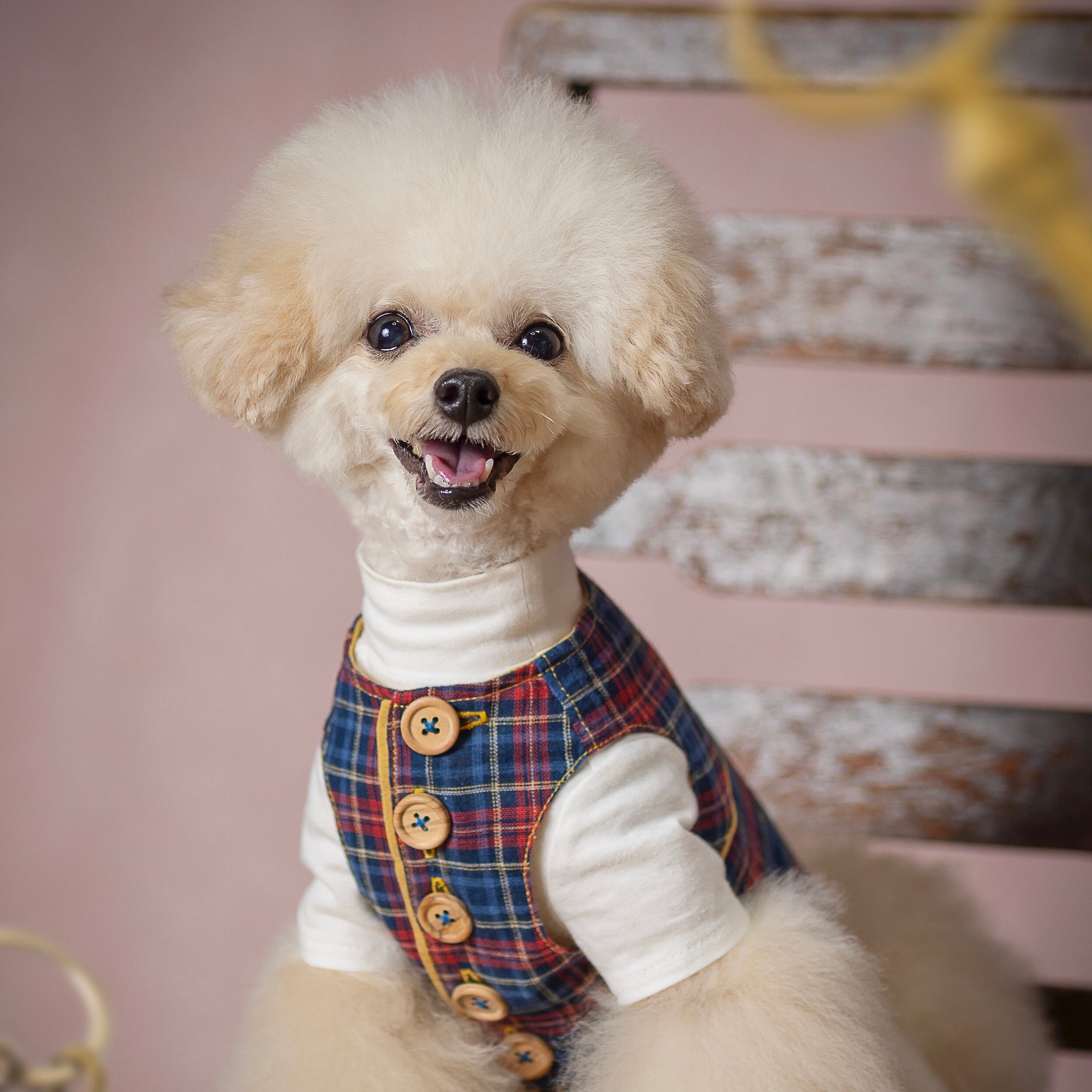 C'estlavee /Vintage Check vest8/24〜 愛犬のおしゃれを楽しむための「Vintage Check vest」!クラシカルなビンテージチェック柄が魅力的で、愛犬ちゃんの個性を引き立てるアイテムです。ウッドボタンがアクセントとなり、ナチュラルで温かみのある印象を与えます。裏地にもこだわりがあり、着心地が抜群です。 さらに、同じデザインのone-pieceとお揃いコーディネートが楽しめるため、特別な日のお出かけにぴったりな一着です。どんなシーンでも活躍し、愛犬との絆を深める素敵なアイテムとして、ぜひお