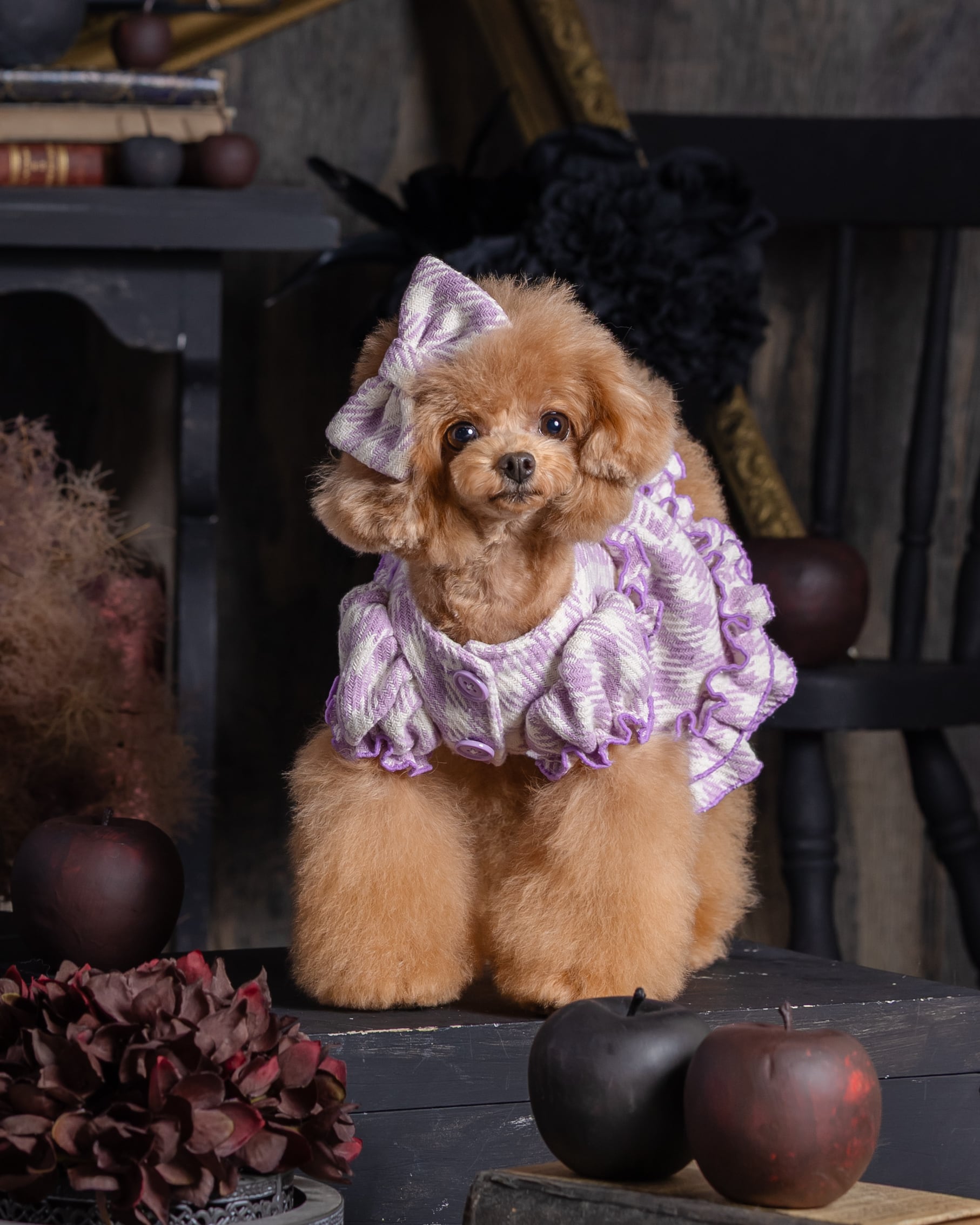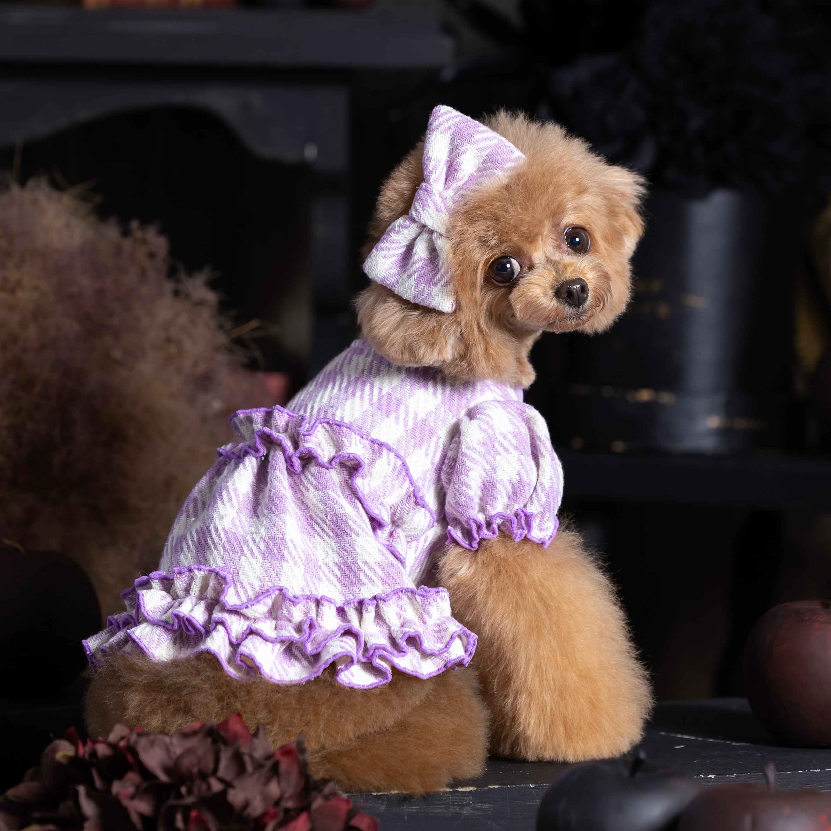 C'estlaveeの新作、Vintage Tweed ONE PIECE SVは、インポートのヴィンテージツイード生地を使用した、ラベンダーのチェックが印象的な犬服です。この一枚で、寒いこれからの季節もおしゃれに、そして可愛く愛犬を演出します。クラシックなデザインが、愛犬の魅力を引き立て、日常のお散歩や特別な日にもぴったりです。