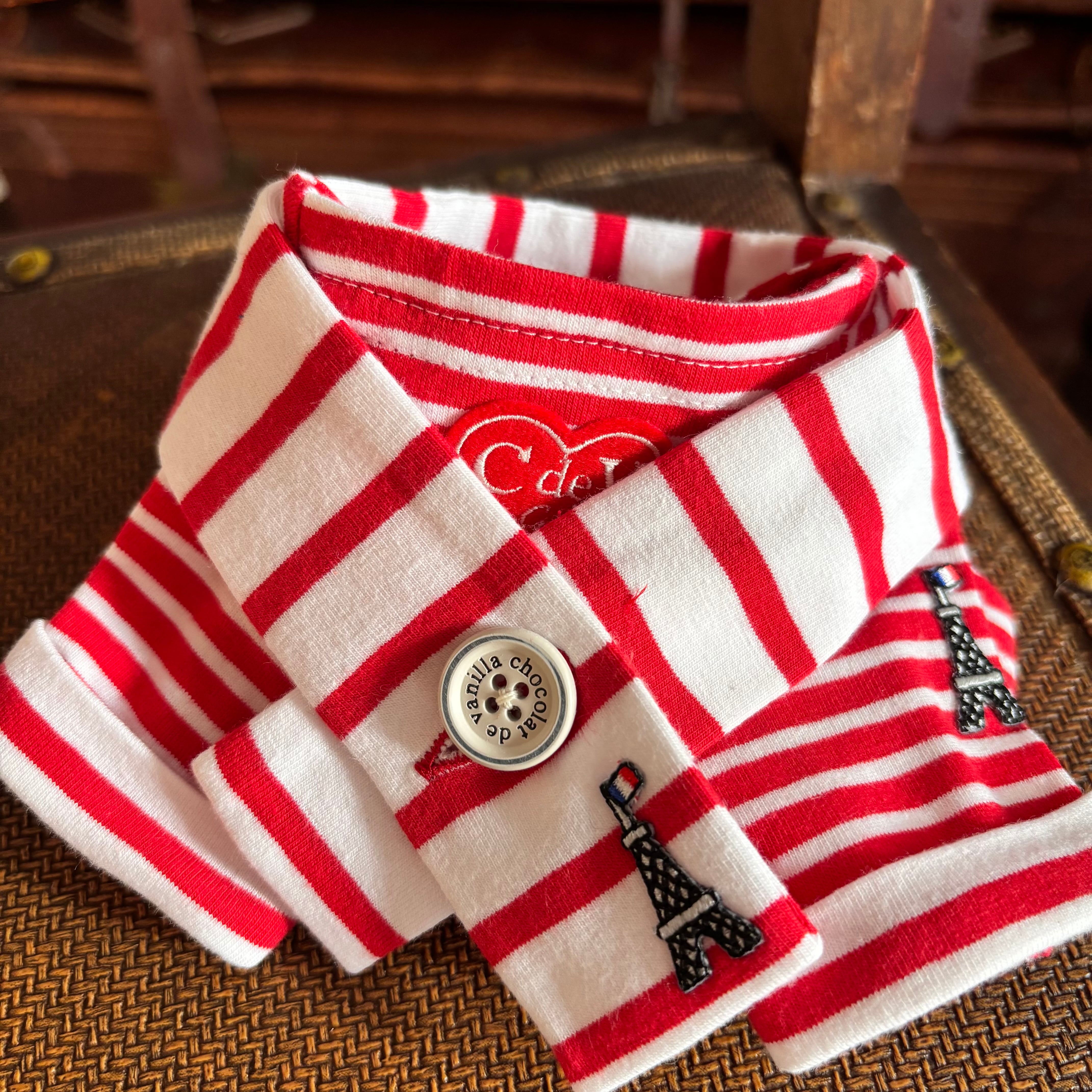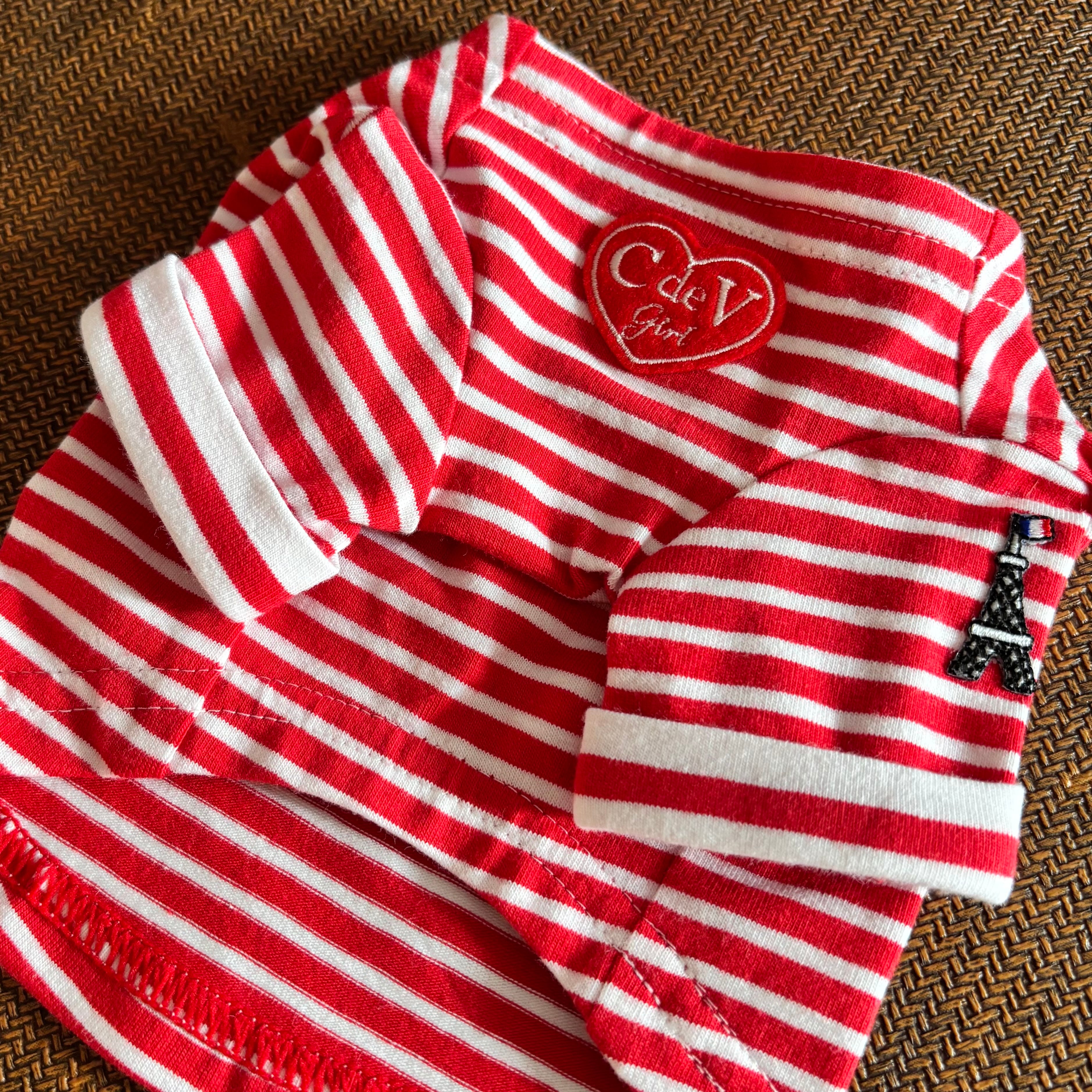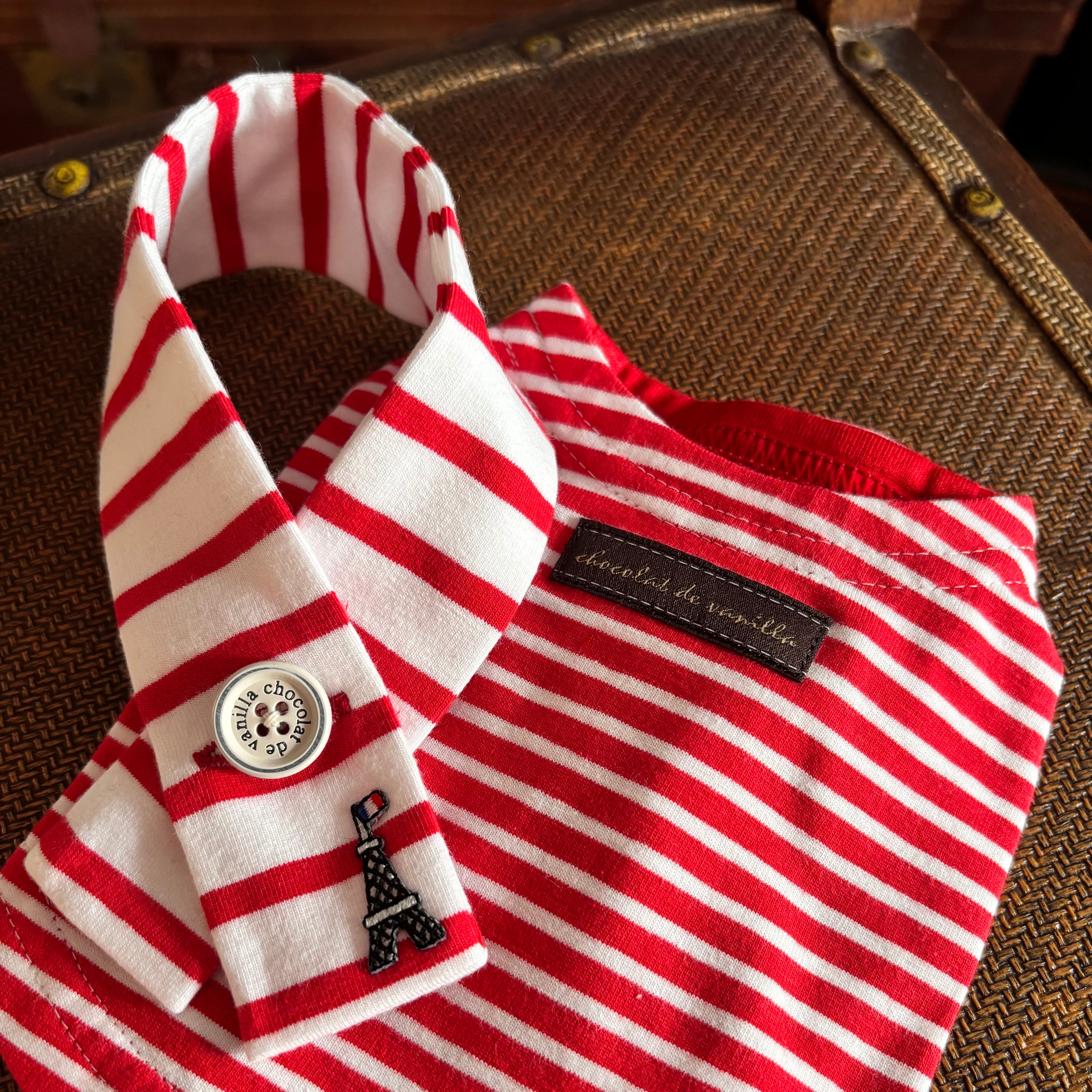 **巴里に恋して アトリエgg** おしゃれな赤のボーダー柄が目を引く、愛犬のための半袖Tシャツです。この一枚は、フレンチスタイルのエッセンスを取り入れたデザインで、愛犬の日常を特別なものに彩ります。着心地も良く、しっかりとした素材感が愛犬を包み込みます。
